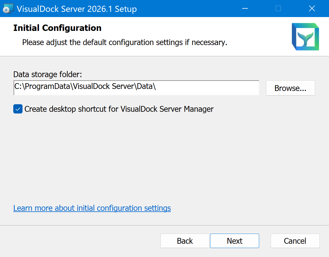 Create desktop shortcut for VisualDock Server Manager: Leaving this option selected is recommended, since VisualDock Server Manager is used to configure and maintain VisualDock Server.