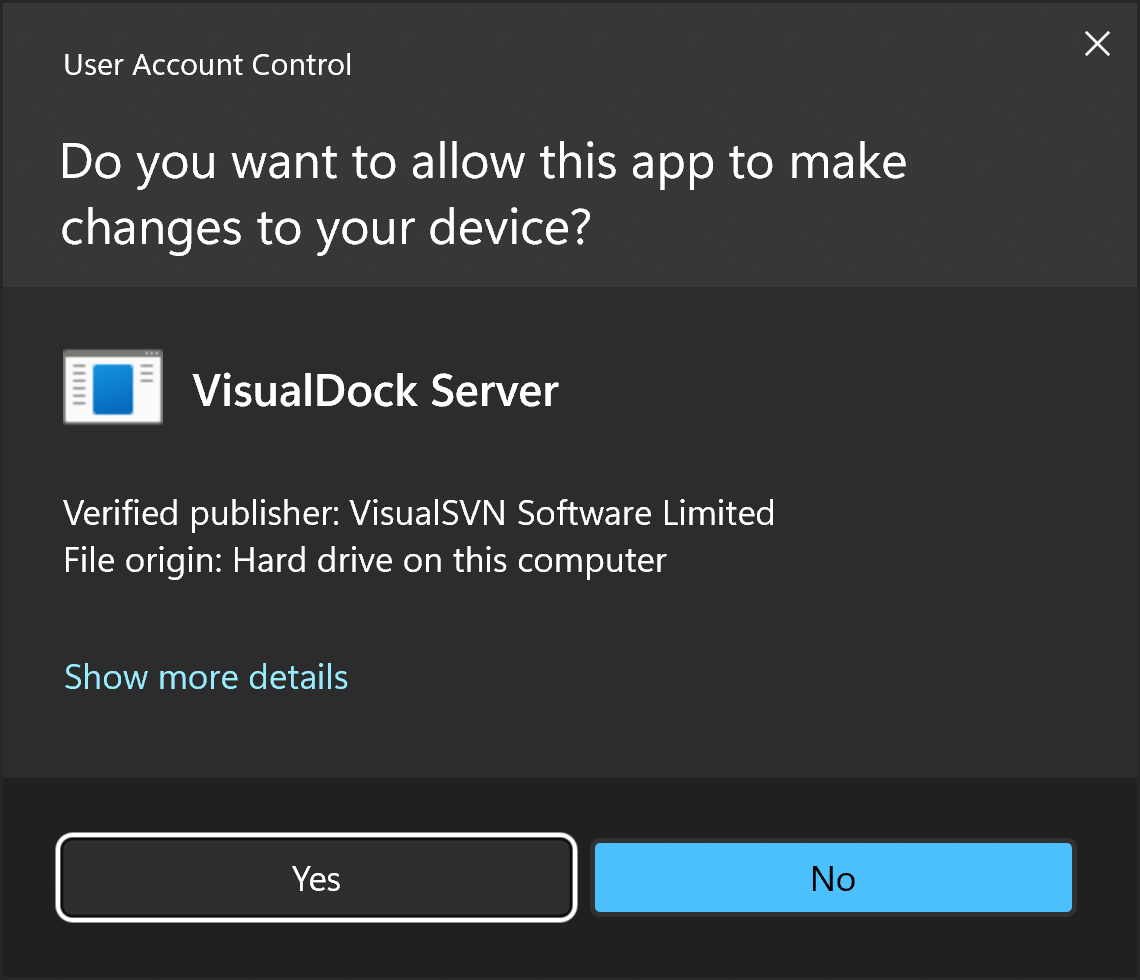 If you are prompted with the "Do you want to allow this app to make changes to your device?" message, check that the verified publisher is VisualSVN Software Limited, and click Yes to continue.