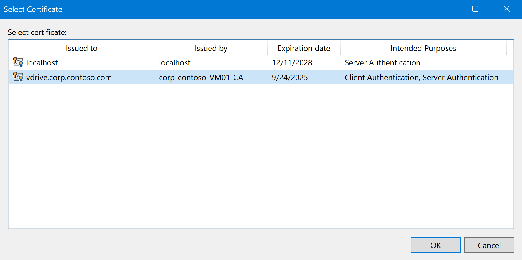 To do this, click Select certificate and pick a certificate that matches the configured Hostname and meets other requirements. The selected certificate must be valid and trusted on the client computers.